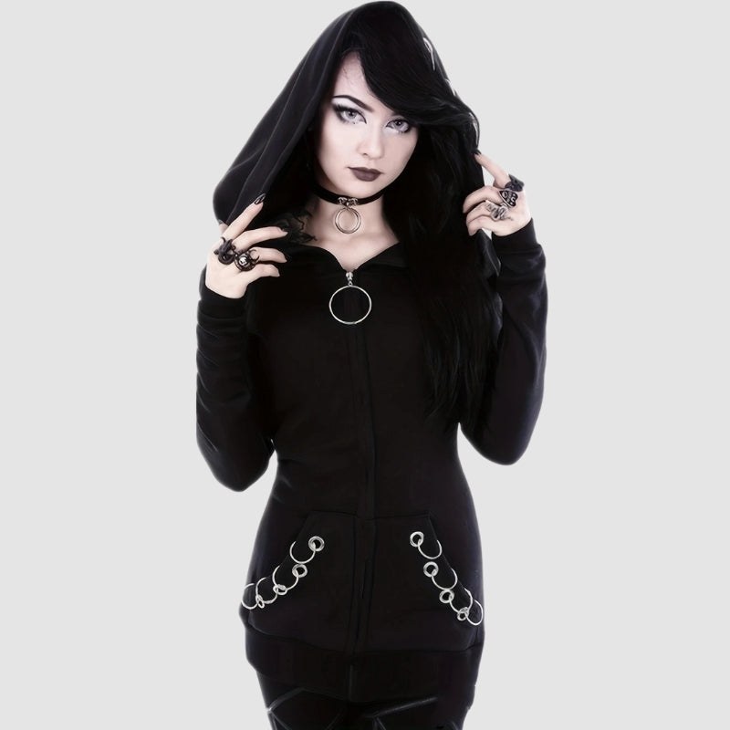 - Fason: luźna bluza z kapturem, zapinana na zamek