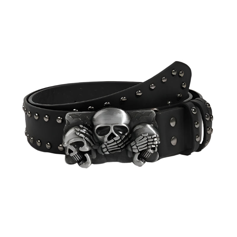 Pasek gotycki z czaszkami i ćwiekami - klamra z motywem "see no evil"